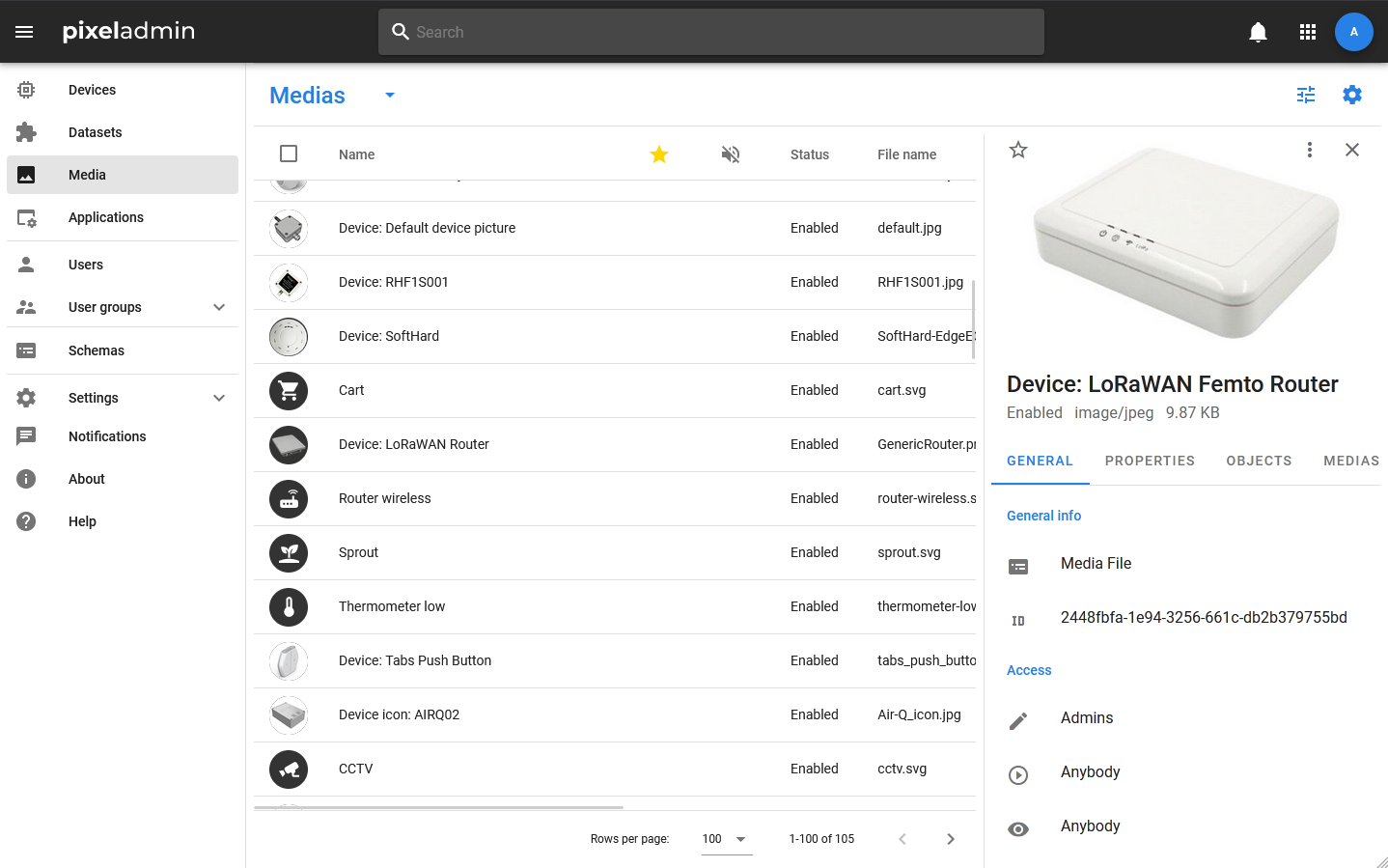 Unlike devices and datasets that use different data schemas, the data schema of media objects is uniquely defined in the system.