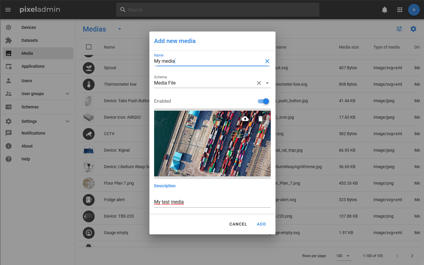 To create a new media object, select Media > in the Media table toolbar Add new. In the window that opens, specify the name and value of the Media Enable / Disable status. After the object is created, its card opens and you can proceed to editing individual properties and uploading a media file.