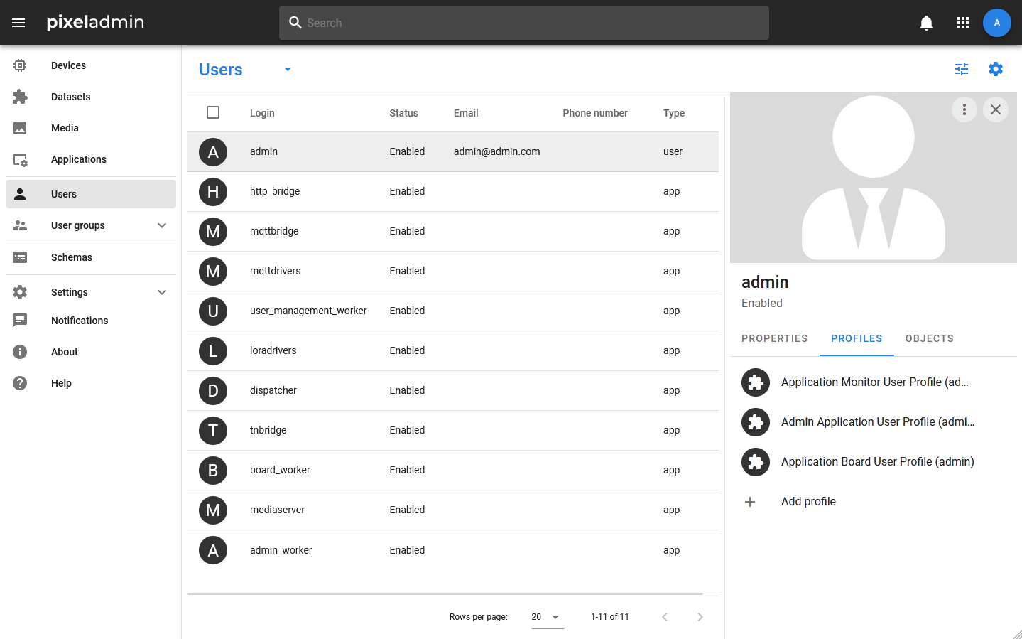 The profile can be disabled or deleted. Disabling allows you to deny the user access to the application, while preserving its settings: this may be necessary in case of temporary blocking. If necessary, the profile can be edited by the administrator through the Admin Pixel: since the profile is a dataset, all the same actions are available for it as for any other dataset.