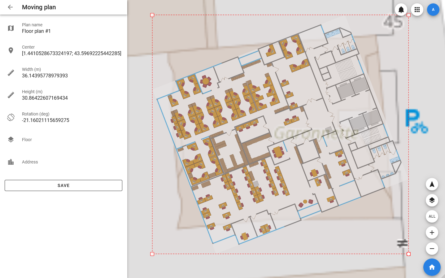 The loaded plan can be scaled with the same proportions and rotated in visual mode: this allows you to position it on the map so that the position of the plan corresponds to the actual position of the objects.